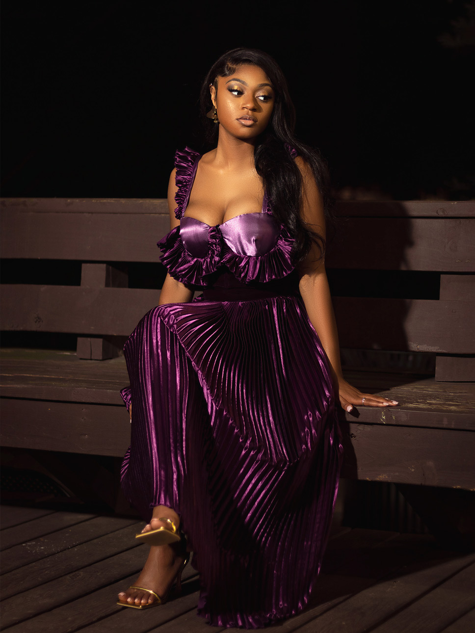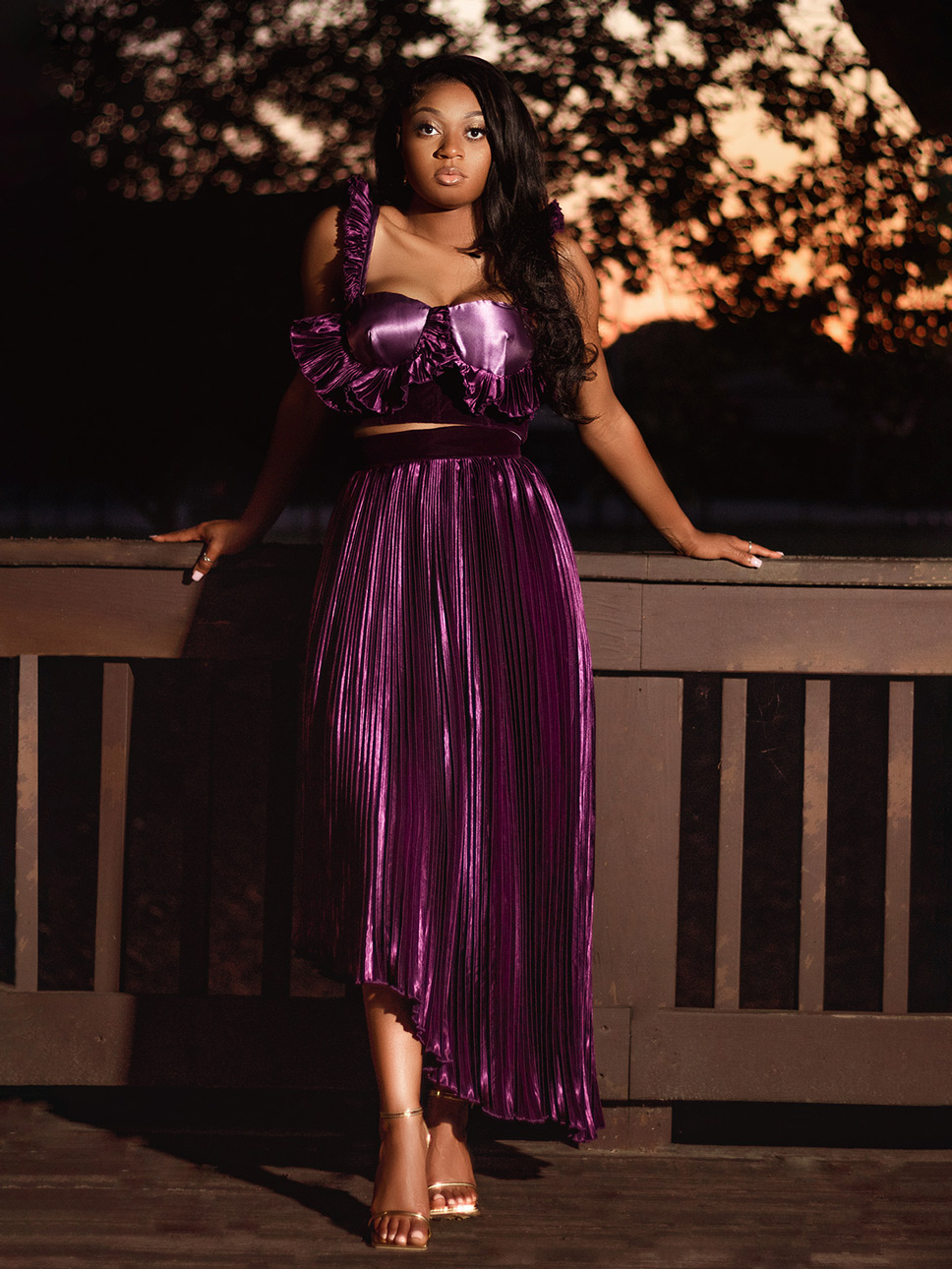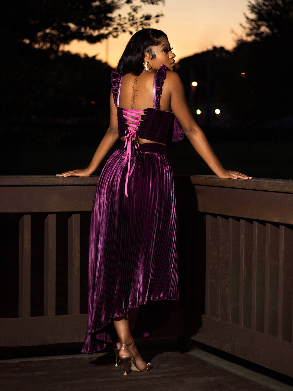 The Popielo ensemble, featuring a structured bustier and a pleated asymmetric skirt, embraces the female form flawlessly. Crafted from high-quality Fiber Satin, Polyester, and Velvet, this set is designed to enhance the wearer's silhouette. For optimal care, it is recommended to have it dry cleaned, ensuring its longevity and pristine appearance.